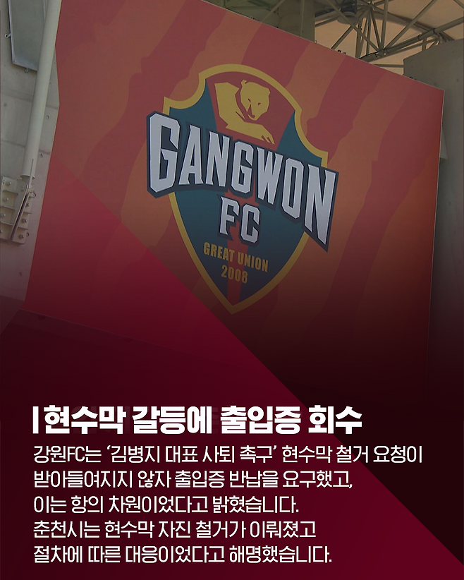 강원FC는 ‘김병지 대표 사퇴 촉구’ 현수막 철거 요청이받아들여지지 않자 출입증 반납을 요구했고,이는 항의 차원이었다고 밝혔습니다.춘천시는 현수막 자진 철거가 이뤄졌고절차에 따른 대응이었다고 해명했습니다.