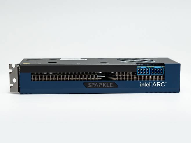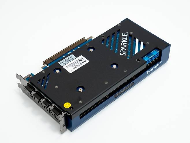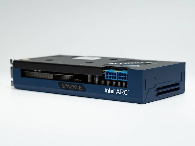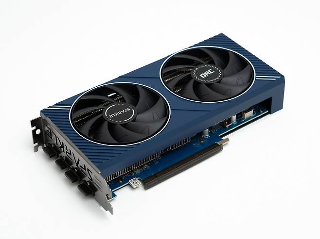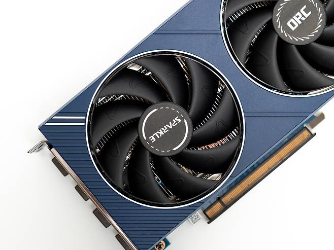 SPARKLE Arc A580 ORC OC D6 8GB의 외형을 살펴보면 크기는 가로 222mm, 세로 101mm이며 높이는 2.2슬롯의 슬림한 두께를 가지고 있어 일반 시스템은 물론 미니 PC나 SFF 시스템을 구축할 때 유용할듯합니다. 하우징의 컬러는 인텔을 상징하는 파란색 계열의 네이비 컬러 이며 쿨링팬은 듀얼 팬으로 구성 되어 있습니다.