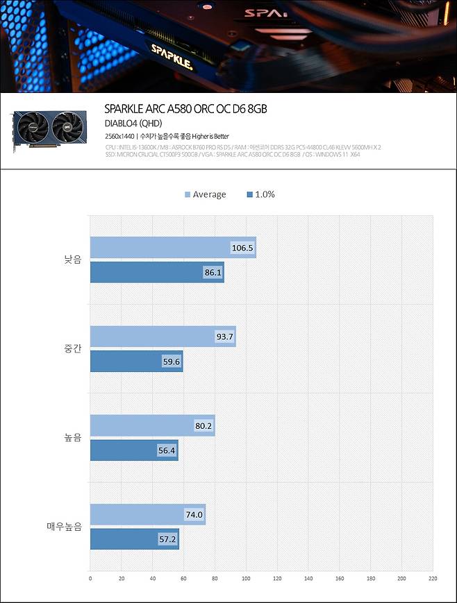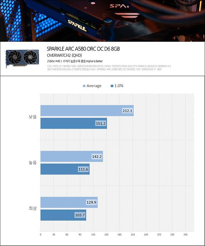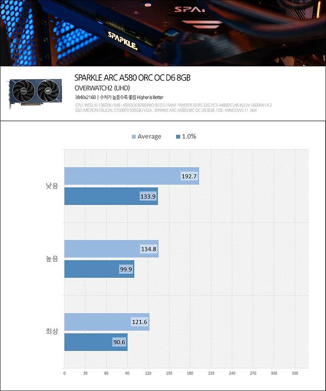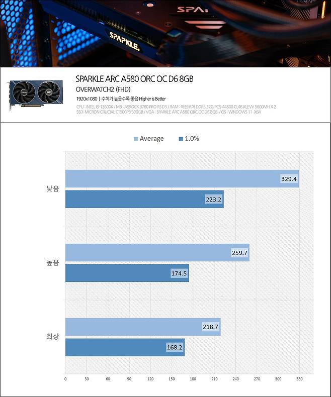 이제는 인텔 ARC A580의 게임 성능을 확인해 볼 텐데요. 오늘 테스트에 사용된 게임은 오버워치2, 팰월드, 디아블로4 이며 FHD/QHD/UHD 세 가지 해상도에서 그래픽 프리셋을 변경해가며 프레임을 측정하였습니다.
