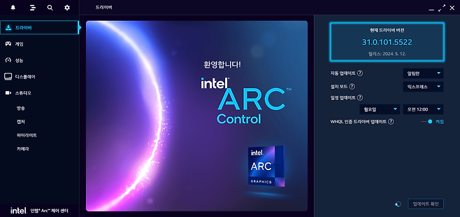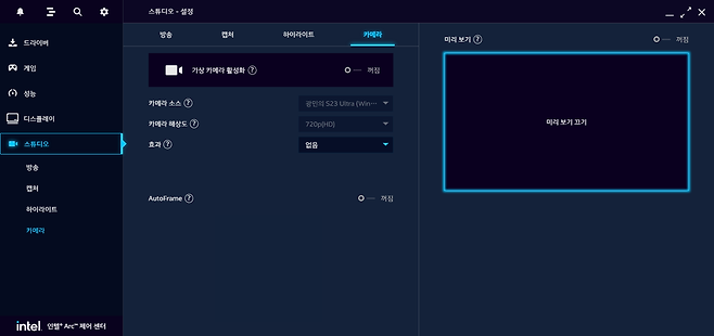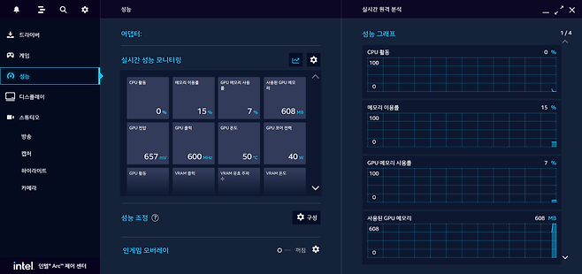 인텔 아크 그래픽카드는 인텔® Arc™ 제어 센터 소프트웨어를 통해 드라이버 업데이트나 게임라이브러리 관리, 방송 송출과 화면 녹화 등을 할 수 있는 크리에이터 스튜디오 기능을 제공합니다.