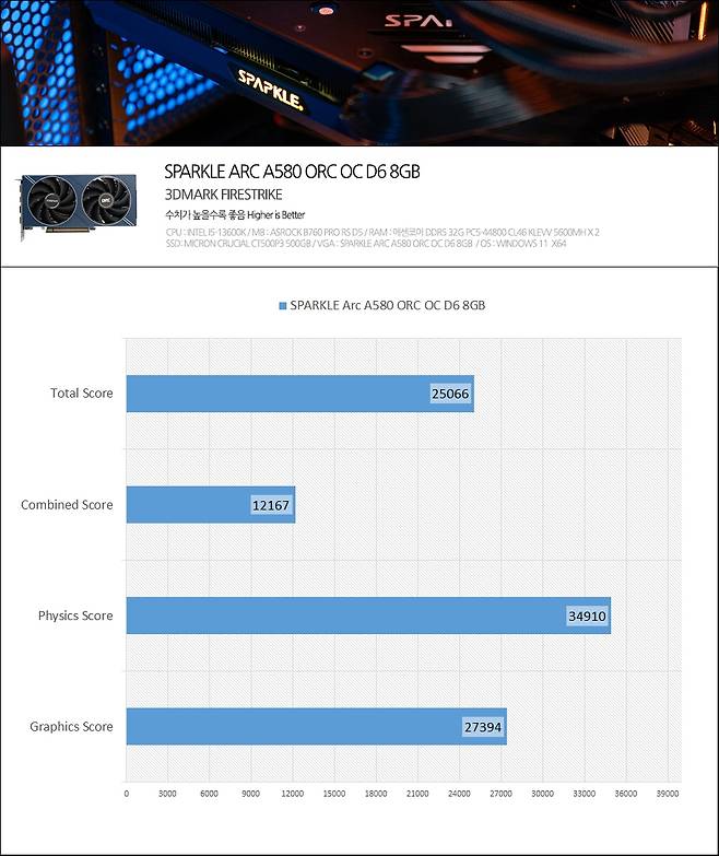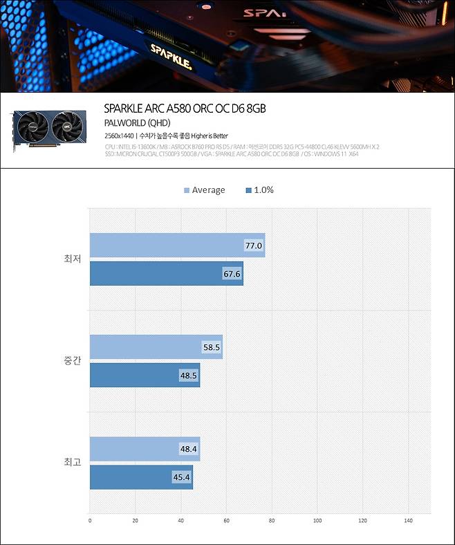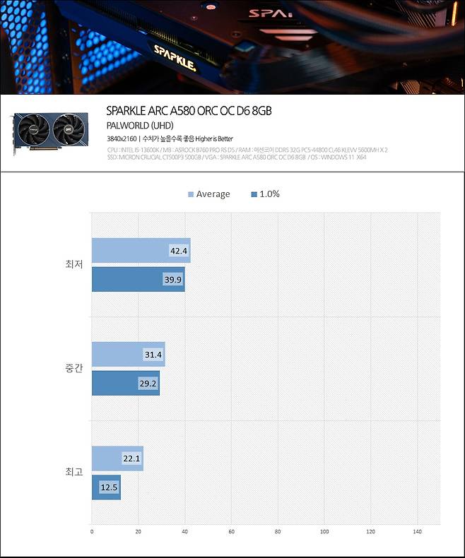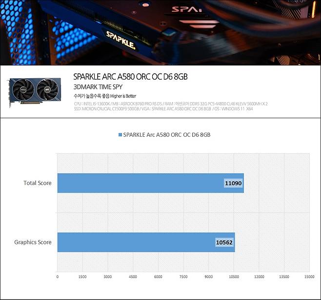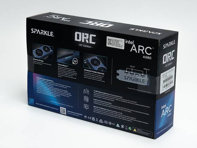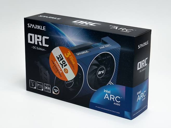 하지만 최근 DX11 기반의 게임 성능을 최대 48%까지 향상시키는 드라이버가 업데이트되면서 이제는 콘텐츠 제작 성능뿐만 아니라 게임 성능까지도 꽤 만족스러운 결과를 보여주며 우스갯소리로 성장형 그래픽카드라는 별명까지 생겼는데요. 오늘은 그중에서 메인스트림급 제품인 (주)코잇에서 출시한 SPARKLE Arc A580 ORC OC D6 8GB(현재 최저가 287,910원)의 사양과 성능에 대해서 살펴보겠습니다.