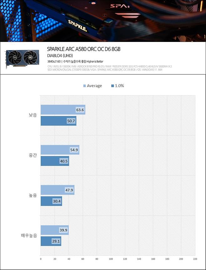 마지막으로 디아블로4의 테스트 결과입니다. 그래픽옵션 매우높음에서 FHD 평균 103프레임, QHD 평균 74프레임, UHD(4K) 해상도에서는 평균 약 40프레임이 측정되었는데요. 디아블로4의 경우 인텔의 업스케일링 기술인 XeSS를 정식 지원하기 때문에 프레임과 이미지 품질을 향상시켜줄 수 있습니다.