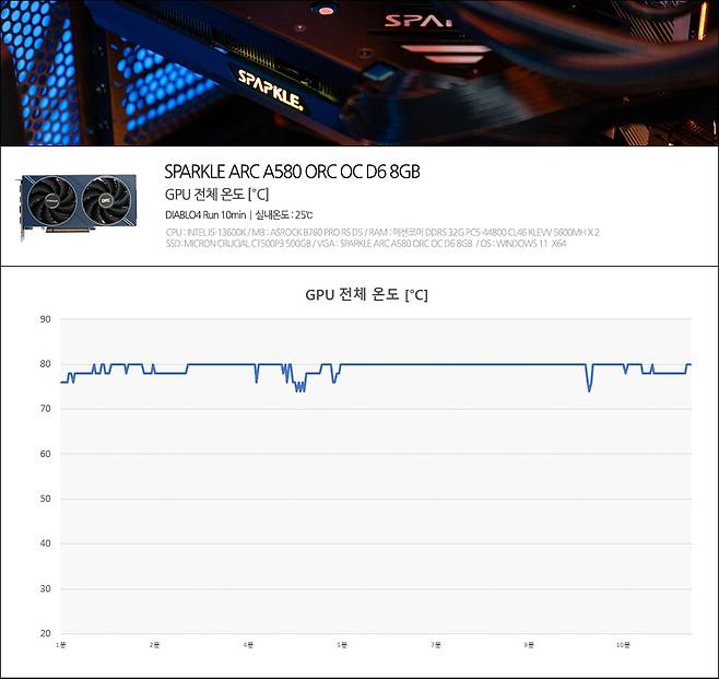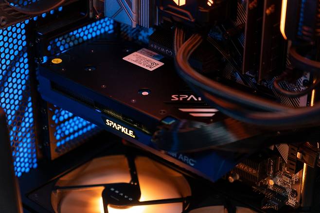SPARKLE Arc A580 ORC OC D6 8GB는 앞서 소개해 드렸듯 측면에 위치한 로고가 그래픽카드 온도에 따라 색깔이 변해 실시간 온도를 모니터링할 수 있습니다.