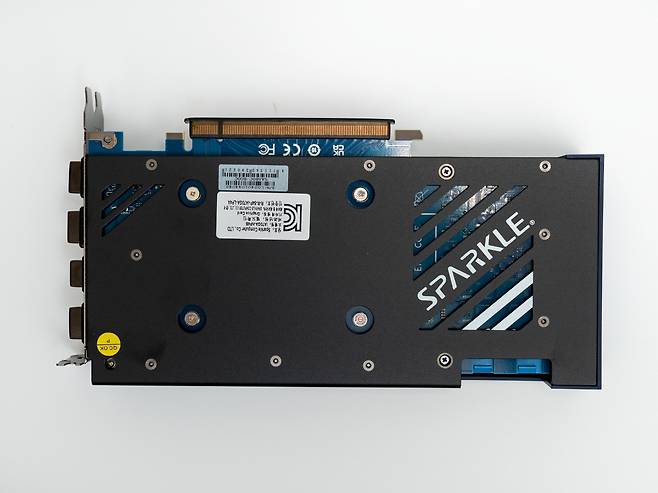 특허받은 써멀씽크 열센서가 탑재되어 본체 측면에 있는 SPARKLE 로고에 그래픽카드 온도에 따라 LED 색상이 변경되어 손쉽게 온도를 모니터링할 수 있습니다. 전원 포트는 8핀 X 2개로 구성되어 있습니다.