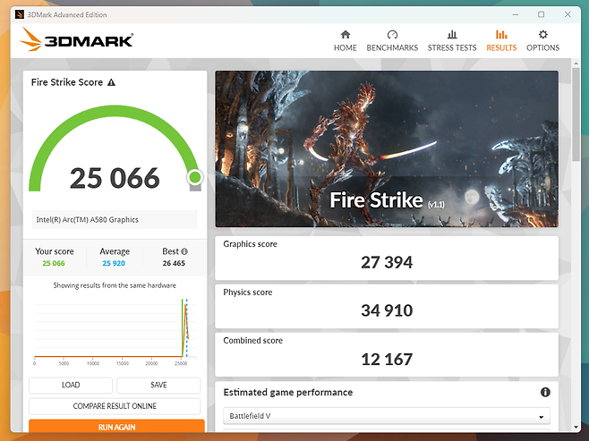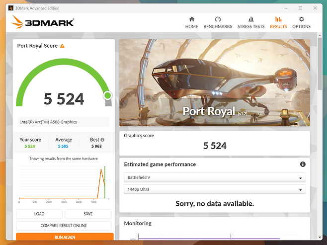3DMARK 벤치툴 테스트 결과 파이어 스트라이크의 그래픽 스코어는 27394점, 타임 스파이 그래픽 스코어는 27394점 그리고 Port Royal 구동 점수는 5524점이 마크되었습니다. RTX 3060 Ti 보다 소폭 낮지만 RTX3060 보다는 높은 스코어가 확인되었습니다.