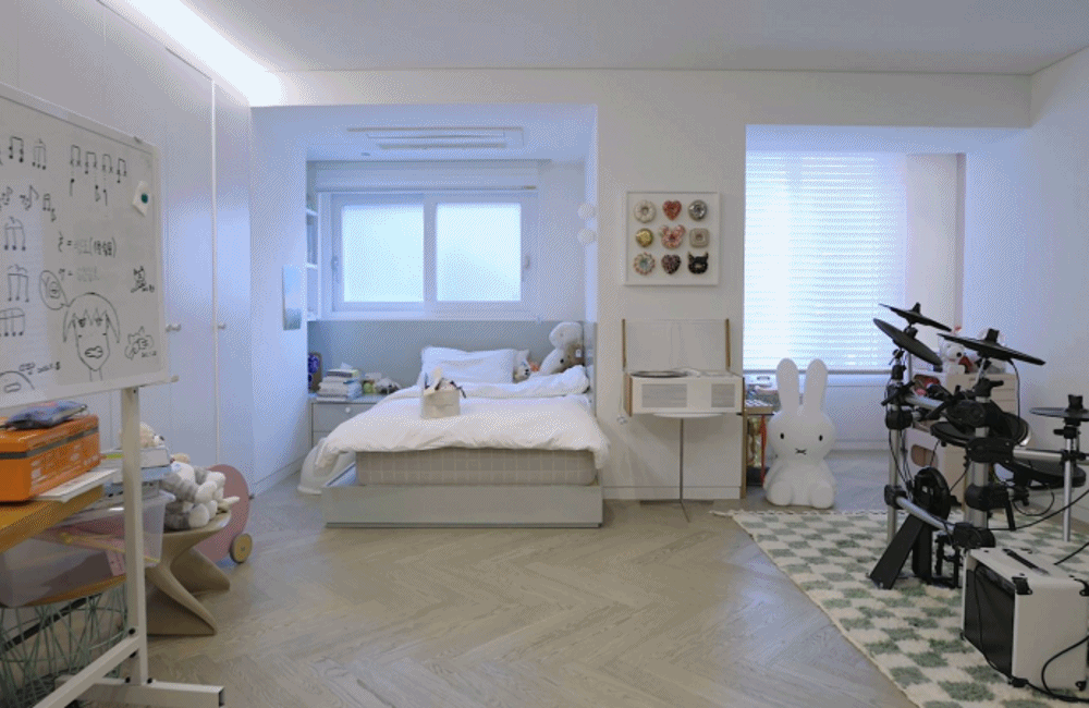 사실 원래 이 방은 부엌이었는데, 아이 방과 위치를 바꿨다. 가운데의 벽을 파티션으로 두고, 한쪽은 자면서 쉬는 공간으로 만들었다. 나머지 한 쪽은 전자 드럼을 놓고 미니 드레스 룸을 꾸려 아이가 취미 생활을 즐길 수 있도록 했다.