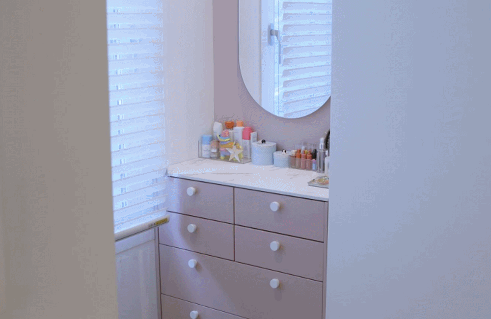 아이가 고학년이 되면서 사춘기에 접어들고 있다. 그래서 분홍색으로 화장대를 만들어 주고 필요한 소품도 놓을 수 있게끔 인테리어 했다. 짐이 많아지는 시점에 맞춰 다양한 잡동사니를 넣을 수 있는 트롤리도 함께 마련해 유용하게 사용하고 있다.