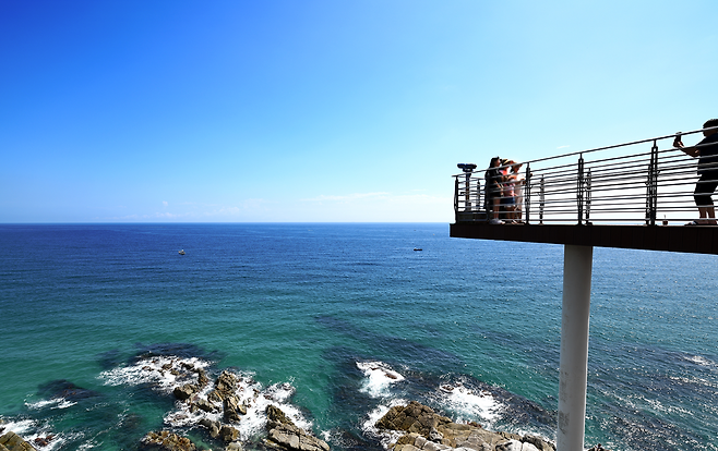 망원경도 설치되어 있어 망양정해수욕장과 주변 바위, 파도까지도 생생하게 감상할 수 있어요.화장실 가는 길마저도 포토존!