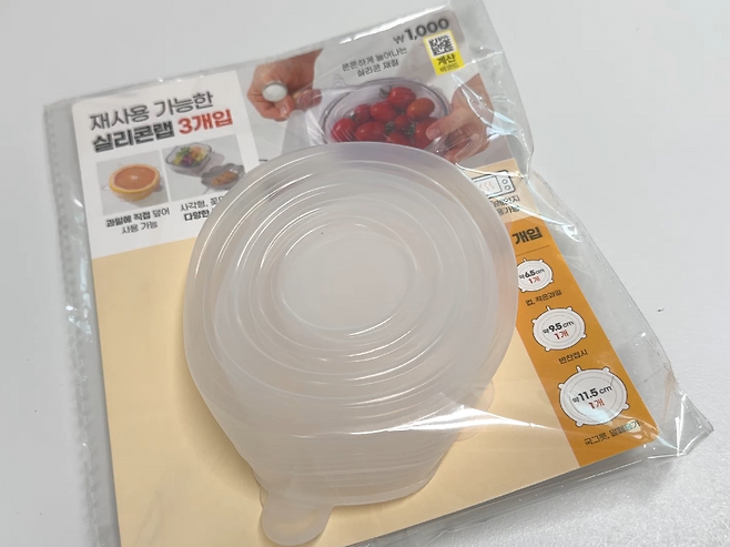 재사용이 가능한 실리콘 랩인데요 가격은 천 원인데 각각 다른 크기로 3가지가 들어 있어서 편리하더라고요