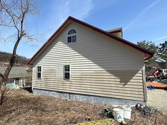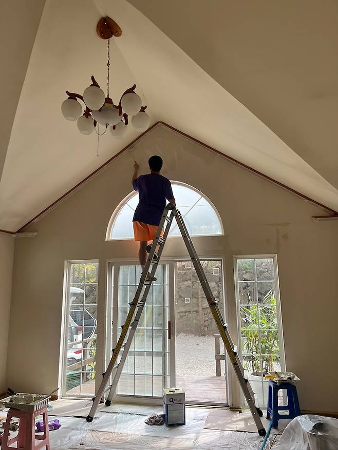외관 페인트칠을 하던 과정입니다. 윗부분과 아랫부분 색이 확연히 다르죠? 지붕 부분에도 적색 페인트를 새로 칠해서 엣지있는 지붕이 만들어졌습니다. 근처 집들 중 유일하게 외벽이 하얀색이라 이때부터 저희는 통칭 '하얀집' 이라고 부르기 시작했답니다.