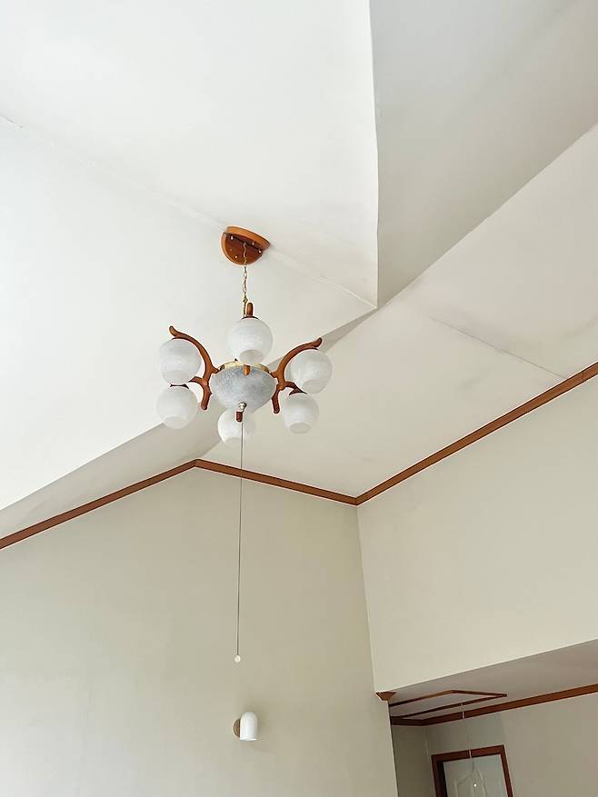거실 천장은 층고가 높아 개방감이 있어요. 한 면으로 된 구조가 아니라 재밌는 것 같아요. 원래부터 달려있던 천장 조명은 빈티지스러운 느낌이 좋아 그대로 유지해뒀습니다. 다른 조명을 달려고 찾아보아도 이것보다 마음에 들어오는 게 없더라구요.