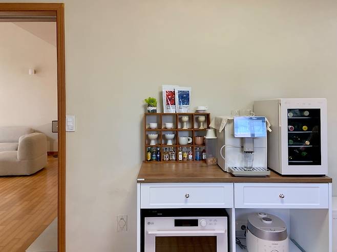 싱크대 맞은 편으로는 주방 가전들을 모아 두었습니다. 광파 오븐이 들어가는 폭이 깊은 수납장을 찾아 구입한 건데 모든 주방 가전이 딱 맞게 들어가더라구요.