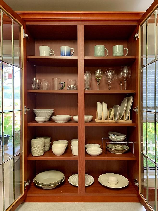 그릇장에는 자주 쓰는 것들만 꺼내 놨어요. 저희 취향은 깔끔한 도자기 그릇이에요! 구입한 것도, 선물 받은 것도, 또 이모가 만들어 주신 그릇도 있는데 전부 이질감 없이 잘 어울리더라구요. 음식을 차릴 때마다 메뉴에 어울리는 그릇을 고르는 재미도 느끼고 있답니다.