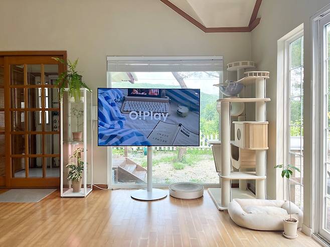 TV 뒷쪽으로 보이는 뷰에요. 냥이들에게도 풍경 감상하라고 자리를 만들어 줬어요. 이 스크래쳐는 제씨가 가장 좋아하는 자리랍니다 :)