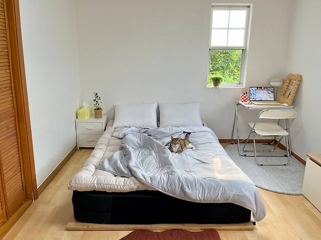 침대에는 매트리스 토퍼를 깔아 폭신하게 사용하고 있어요. 매트리스만 놓는 것보다 폭신한 게 깔려있으니 편해서인지 잠이 더 잘오더라구요!
