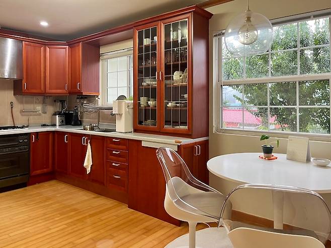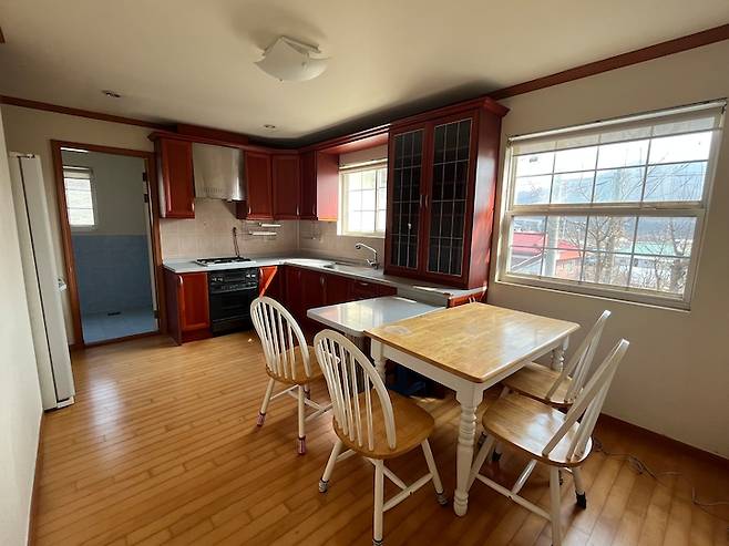 다들 기피한다는 체리색 주방이에요..ㅎㅎ 주방까지 리모델링을 할 수 없는 저희는 체리색을 안고 가기로 했습니다.