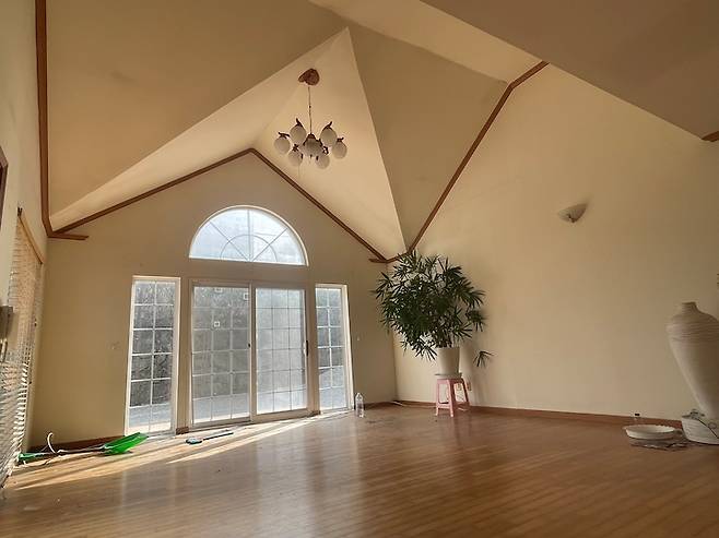 거실은 층고가 높고 천장에 선이 많은 독특한 구조에요. 오래된 흔적이 남아있던 벽면은 직접 셀프 페인팅했습니다. 꼬박 5일이 걸렸어요ㅠㅠ 기존에도 페인트칠이 되어있던 벽이라 오래되어 갈라진 부분은 보수를 하고, 천장을 제외한 모든 벽을 칠했답니다.