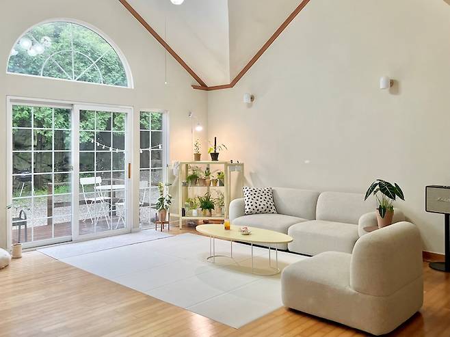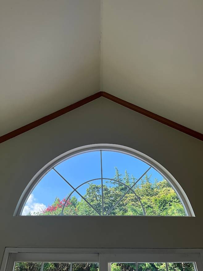 제가 정말 좋아하는 포인트인 아치 창문이에요. 낮에는 시시각각 바뀌는 구름과 바람에 흔들리는 나무를, 저녁에는 밝은 달을 볼 수 있답니다.