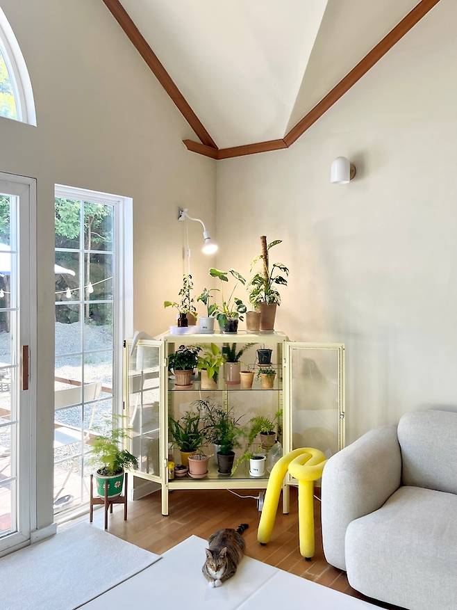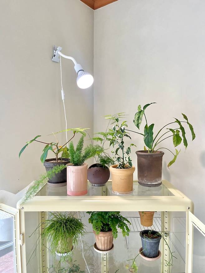 한 켠에는 식물장을 만들었어요. 온습도 관리 뿐만 아니라 고양이에게 해가 될 수 있는 식물들을 장 안에 넣어 관리하고 있습니다.