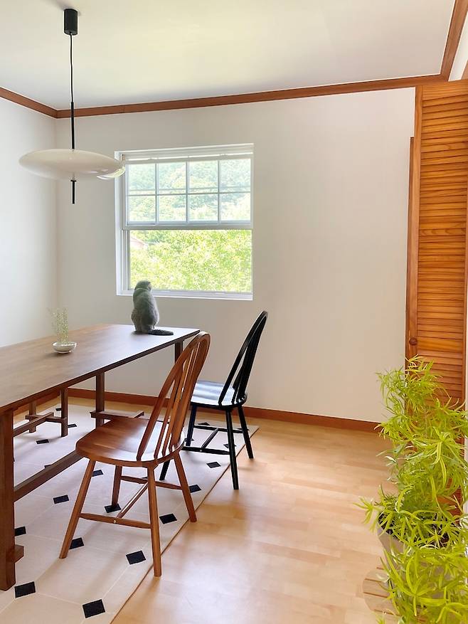 거실과 마주하고 있는 방 하나는 넓은 식탁을 놓고 다이닝룸으로 꾸몄습니다. 주로 집에서 일을 하는 저희의 업무 공간도 되고 책도 읽고 손님들을 초대해 식사도 할 수 있는 공간이에요.