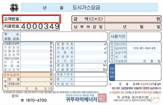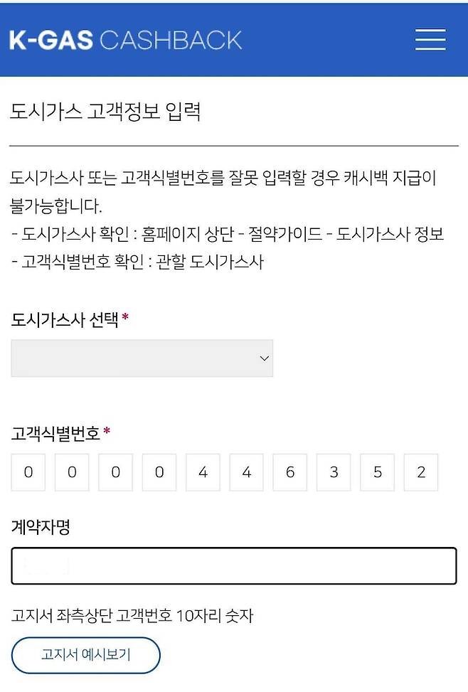 먼저 도시가스 고객 정보를 입력합니다. 도시가스사, 고객식별번호, 계약자명 모두 도시가스 요금 고지서에 적혀 있는데요.