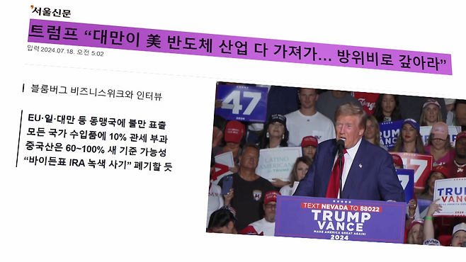 지금 정부 같은 경우에는 한국의 삼성전자나 타이완의 TSMC 같이 외국 기업들도 보조금을 줘서 미국 내에서 공장을 만들어라 하고 있는 상황입니다. 그런데 트럼프 후보가 우려되는 부분은 그러한 외국 기업들도 자국 기업과 똑같은 그런 대접을 해줄 것인가 라는 부분이 이제 걱정이 되는 거죠.