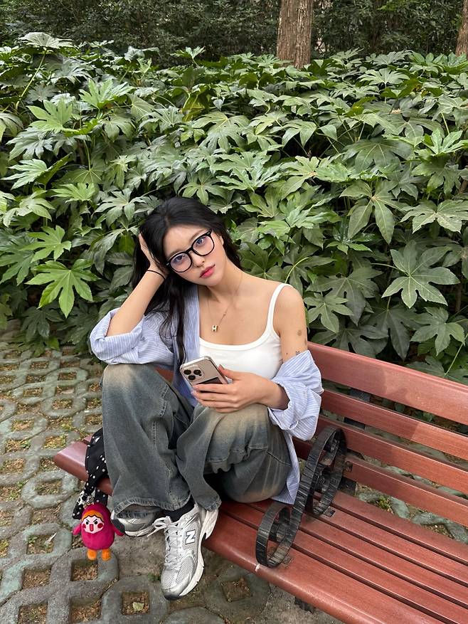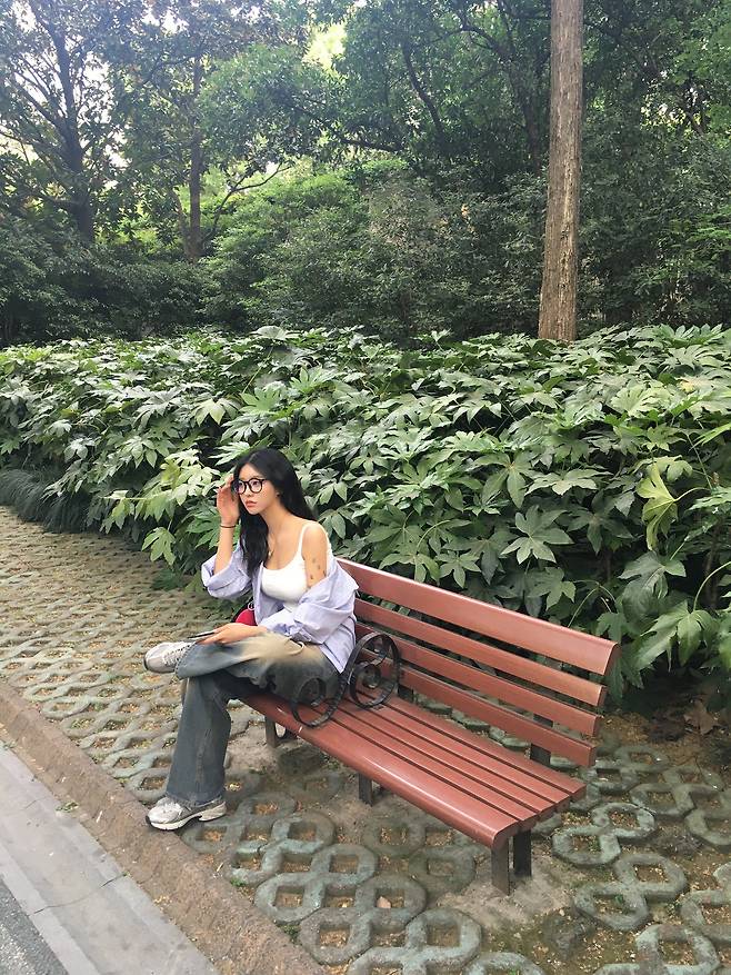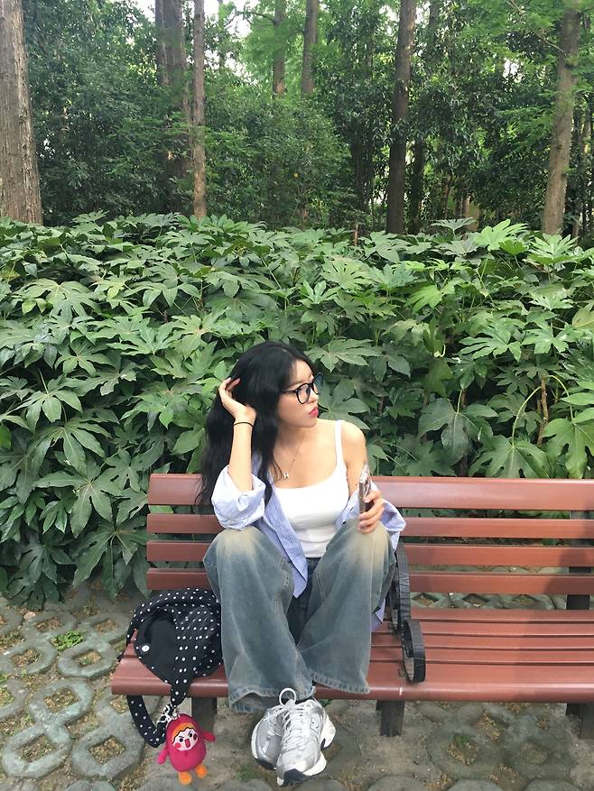 무성한 나무들 사이에 하늘하늘한 셔츠에 안경까지 꾸안꾸 긱시크 룩으로 제격