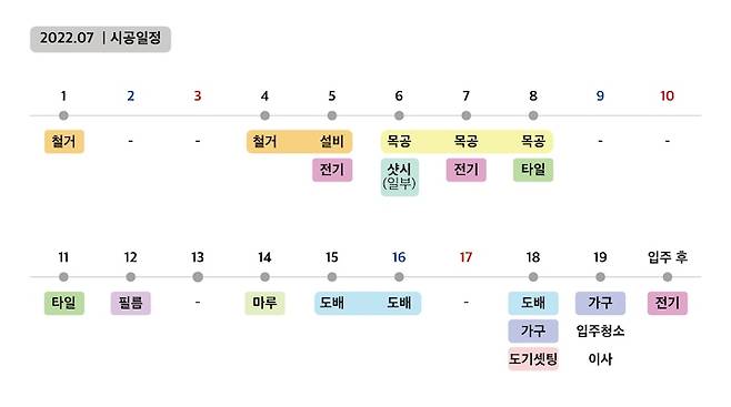 시공 기간 : 2주 반 시공 일정 : 철거/설비 - 전기 - 샤시(새시) - 목공 - 타일 - 필름 - 마루 - 가구 - 도기 셋팅 - 전기