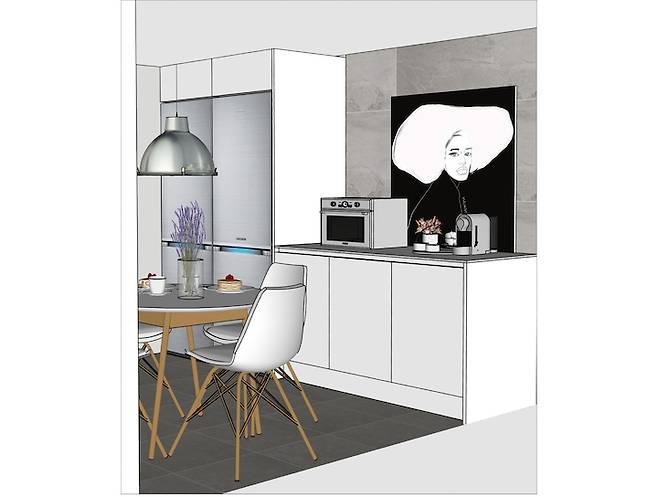 처음에는 대면형 주방으로 여러 안을 잡아 보았으나, 가로 공간이 좁은 주방 공간이라는 구축의 한계가 있었어요. 아쉽지만 대면형 주방은 포기하고 실사용 환경을 고려하여 실용적인 주방 공간으로 꾸며 보았어요.