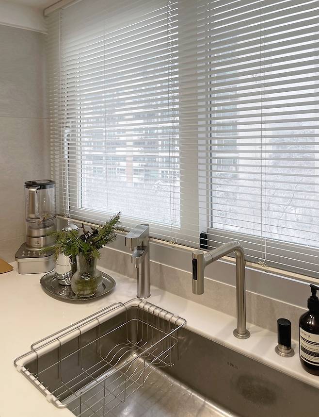 기존의 발코니 창가 쪽으로 배치한 싱크대 덕분에 단지 구경하며 재밌게 설거지를 할 수 있게 되었어요.