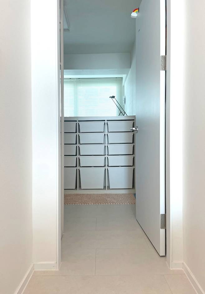 발코니를 확장했기 때문에 세탁기를 둘 공간이 없어져서 꽤 오랫동안 고민하였는데, 기존의 주방 벽면 넓이에 맞춰 세탁기장을 설치했고 슬라이딩 도어를 달아 평소에는 보이지 않게 두었습니다.