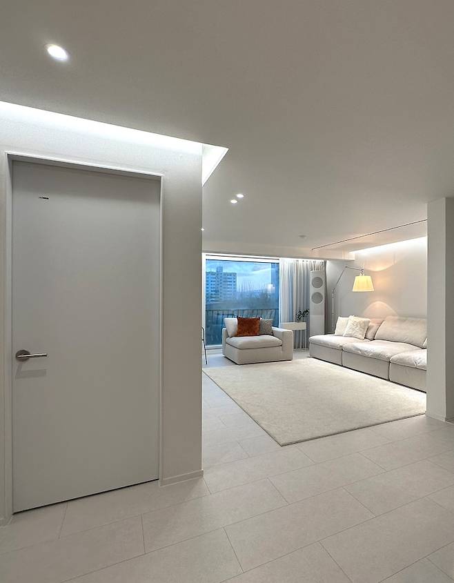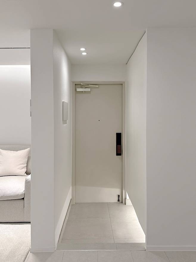 바닥은 주방과 동일한 600각으로 그레이 타일로 통일감을 주었어요. 신발장은 화이트 컬러를 사용하여 벽체와 통일시키고 현관문은 아이보리 색으로 마감하여 밝은 분위기를 만들어 주었어요. 신발장 하단에는 간접 등을 넣어 화사한 분위기를 더하여 주었답니다.