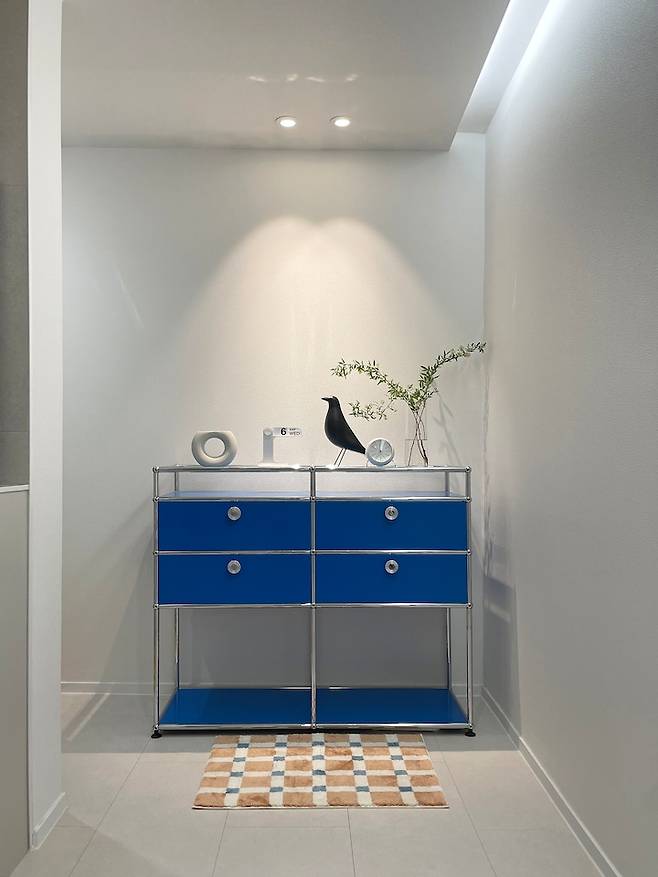 깔끔한 화이트 베이스 인테리어에 채도가 높은 블루 컬러 가구를 두어 공간에 포인트를 주었어요. 블루 컬러의 시스템 가구를 둔 탓에 집안 곳곳에도 미드 센추리 모던 가구들로 꾸며 보았어요.