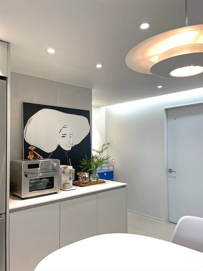 천정에는 우물 천정 몰딩과 중앙에 펜던트 등이 달려 있었는데 모두 철거하여 새롭게 디자인해 보았어요.