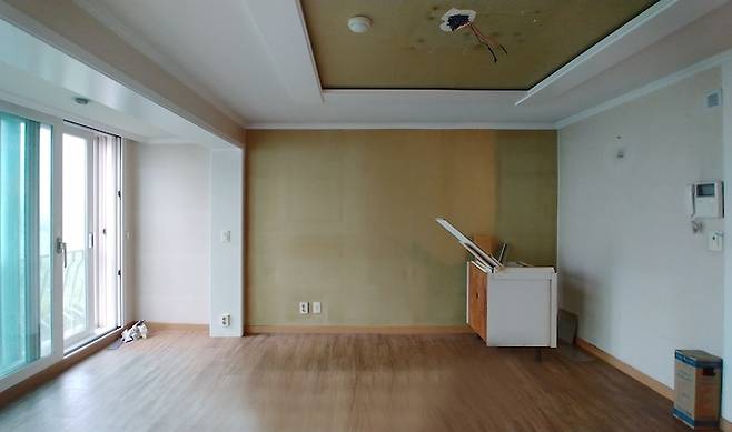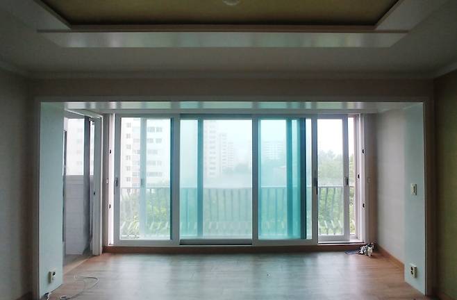 거실 확장은 되어 있었지만 양옆 날개벽 부분은 그대로 남아 있어, 공간이 애매하게 분리되어 있었어요.