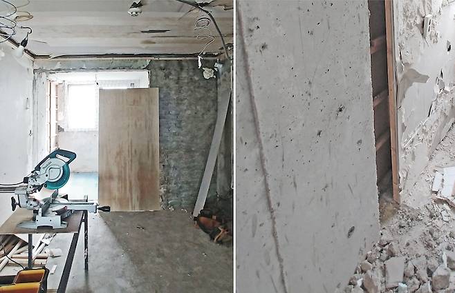 거실은 깔끔한 마감을 위해서, 먼저 확장부 날개벽을 최대한 정리해 주었어요.