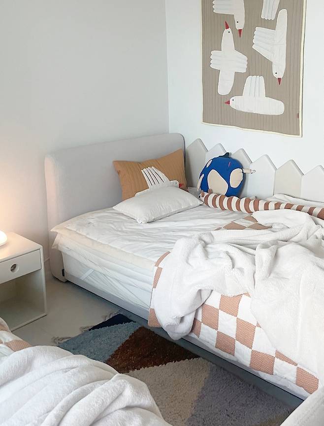 한쪽 벽면에는 침대를 두고, 다른 벽면에는 잠들기 전 책을 읽을 수 있도록 책장을 배치해 보았어요. 잘 때마다 침대에서 장난치며 넘어지고 부딪히는 모습을 보니 패브릭 침대로 선택하길 잘 했다고 생각해요.