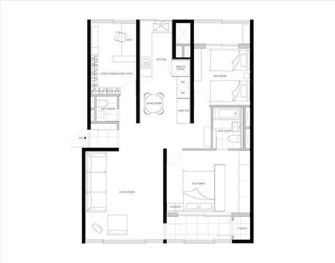 냉장고는 세탁기장 바로 옆에 두었고, 냉장고 옆에는 홈바 공간을 마련해 보았어요. 냉장고와 홈바 앞에는 식탁을 두어 동선도 편리하게 설계해 보았습니다.