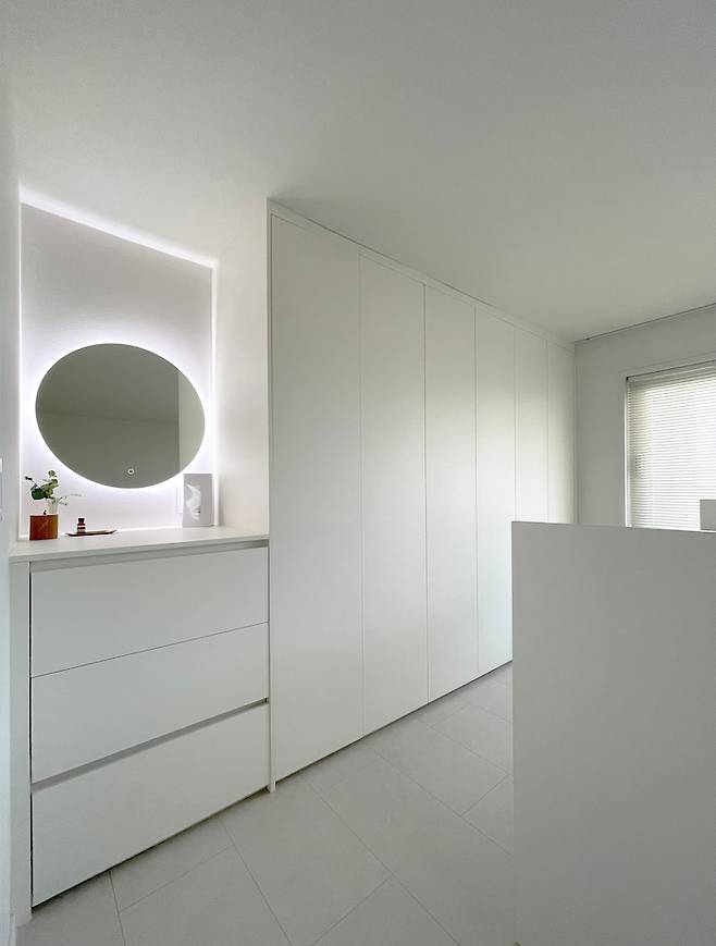 드레스룸 공간에는 화장대도 만들어보았어요. 화장실 바로 앞의 동선이라 너무 편리해요. 화장대 거울은 라이팅 거울을 선택하여 조명이 있는 예쁜 공간이 되었어요.