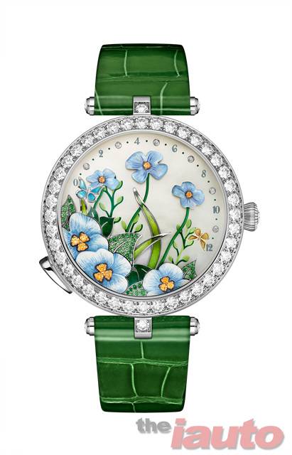 아울러 정원에 활짝 피어난 화관을 연상시키는 레이디 아펠 브리즈 데떼 워치는 화이트 골드와 옐로우 골드 소재를 바탕으로 ‘플리크-아-주르 에나멜’ 기법이 적용된 나비들이 시간을 표시한다. 무광의 마더 오브 펄로 만들어진 다이얼과 샹르베 에나멜이 적용된 잎사귀와 차보라이트 가넷 및 3D 플리크-아-주르 에나멜이 적용된 풀잎들은 전원의 풍경을 그려내고 있다.