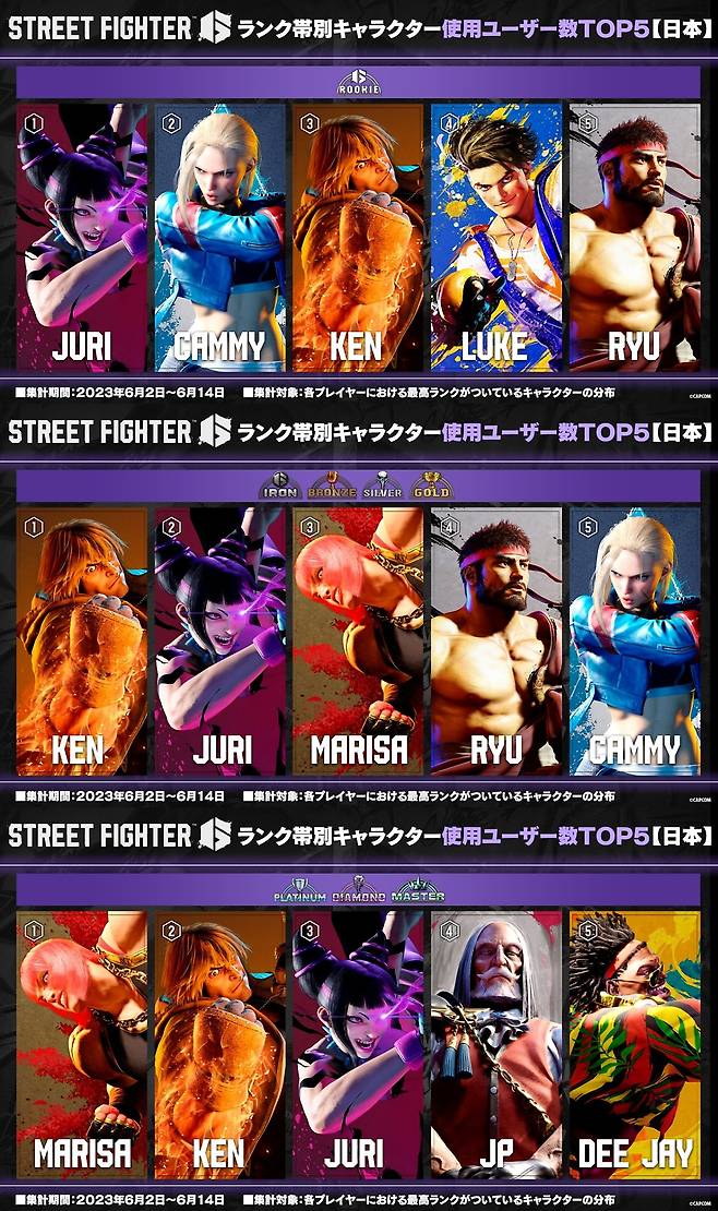 그런데 스트리트 파이터 6에서는 굳건할 것만 같았던 '류춘켄' 트리오에 균열의 조짐이 보이는 듯합니다. 6월 22일 캡콤이 공식 SNS를 통해 지난 2일부터 14일까지의 일본 내 티어별 캐릭터 사용 수를 발표했는데, 어느 티어에서도 춘리의 모습이 보이지 않았거든요. 스트리트 파이터 6에서는 티어를 일정 그룹으로 묶어서 정리하고 있는데요, 그룹별 선호 캐릭터는 다음과 같습니다.