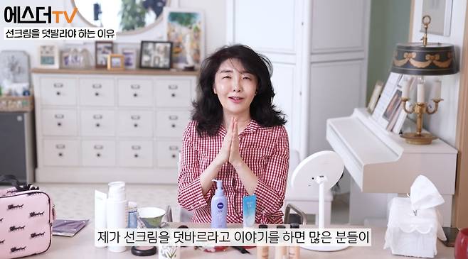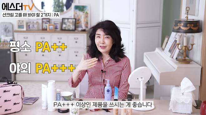 해당 영상 속 여에스더는 "선크림으로 피부 관리하는게 메이크업보다 중요하다"라며 "얼굴이 검게 변하는 것을 막기 위해 평소에는 SPF30 야외는 50 정도의 선크림을 사용해야 하고 PA+++ 이상인 제품을 쓰는 것이 좋다"라고 설명했습니다.