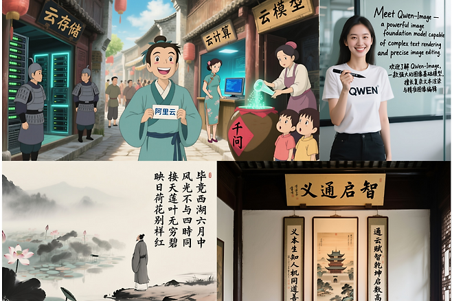 알리바바의 인공지능(AI) 연구팀 큐웬(Qwen)이 텍스트 표현에 특화된 이미지 생성 인공지능 모델 '큐웬 이미지(Qwen Image)'를 공개했다. 큐웬이 이번에 공개한 모델인 '큐웬 이미지'는 '텍스트 삽입 정확도' 측면에서 눈에 띄는 성능을 갖췄다.