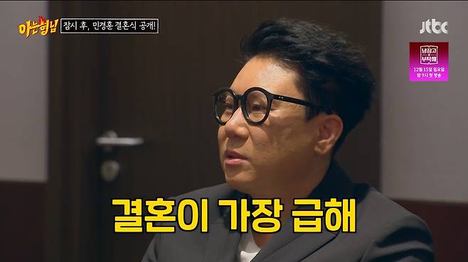 '아는 형님' 동료인 민경훈 결혼식에 참석한 이상민은 "현재 만나는 상대는 없지만, 결혼이 가장 급하다"고 조급한 마음을 드러냈습니다.