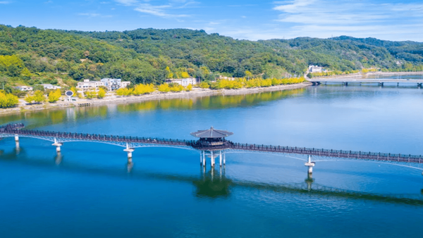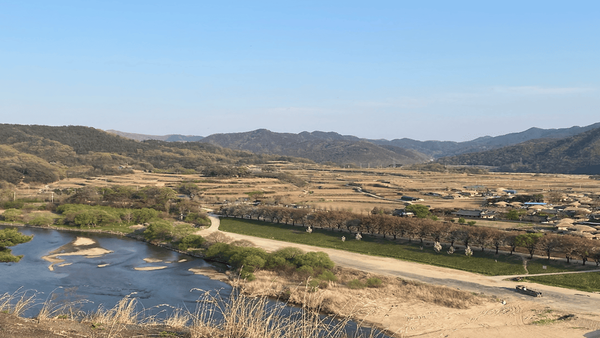 바람은 아직 서늘하지만 햇살은 이전보다 부드럽습니다. 강 위로 비치는 빛이 은은하게 반사되며 풍경 전체를 차분하게 감싸고, 멀리 펼쳐진 전통 마을의 지붕선이 고요한 리듬을 만드는데요. 한참을 서 있어도 지루하지 않을 만큼 평온한 장면입니다.