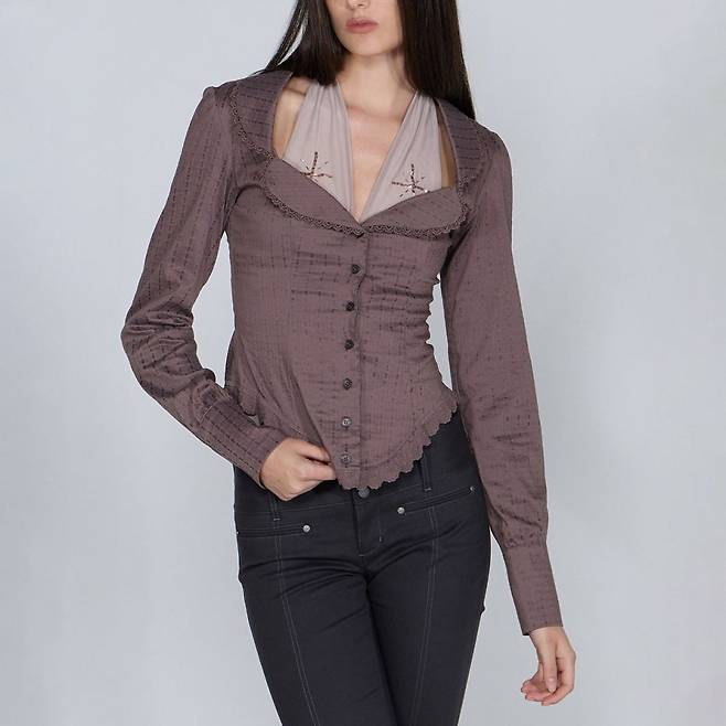 스컬프터의 ‘Clover Leaf Neck Blouse’는 고윤정의 분위기와 완벽히 어울리는 스타일로, 지금 트렌드 속 Y2K 무드와 빈티지 감성을 동시에 반영한 아이템이다.