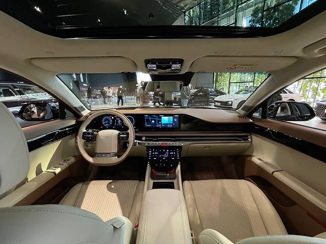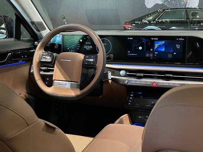 원-스포크 스타일 스티어링 휠은 중앙부 혼커버에 운전자의 차량 조작 및 음성인식과 연계 작동하는 4개의 LED 조명을 적용해 편의성을 향상시키고 미래지향적인 이미지를 더해준다. 이 부분 역시 시장에서는 상당히 호불호가 나뉘고 있지만, 실물로 보면 크게 어색하진 않다.