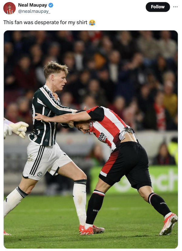 경기 후 모페가 SNS에 “이 팬은 내 유니폼을 간절히 원했다”라며 맥토미니가 자신의 유니폼을 잡아당기고 있는 사진을 올렸다.