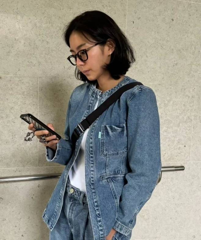 배우 유이가 뿔테 안경에 청청패션으로 힙한 긱시크 외출룩을 완성했다.