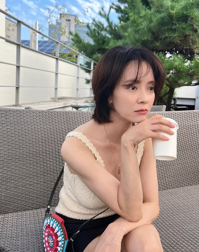 네번째 사진에서 송지효는 크림빛의 니트 슬리브리스와 미니멀한 블랙스커트를 입고 한 손에 커피를 들고 있습니다. 컬러풀한 크로셰 미니백이 심플한 룩에 발랄함을 더하고, 세련된 단발헤어스타일에 노메이크업 분위기가 꾸밈 없이도 분위기를 연출한다.